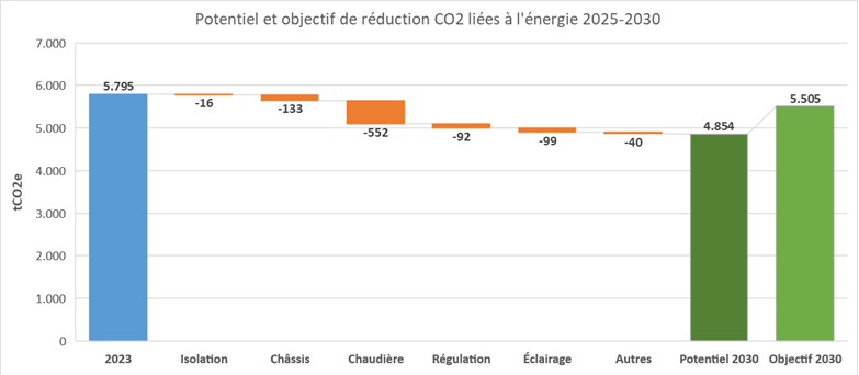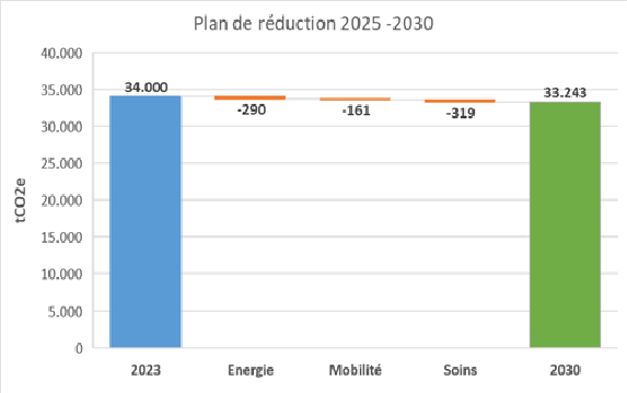 L’objectif global est de réduire de 2% nos émissions gaz à effet de serre d’ici 2030, soit 0,4%/an. Pour atteindre cet objectif, nous réalisons des actions concrètes sur 3 thématiques qui représentent 74% de nos émissions : Soins de santé (-2,5%), Mobilité (-2,5%) et Energie (-5%) à l’horizon 2030.